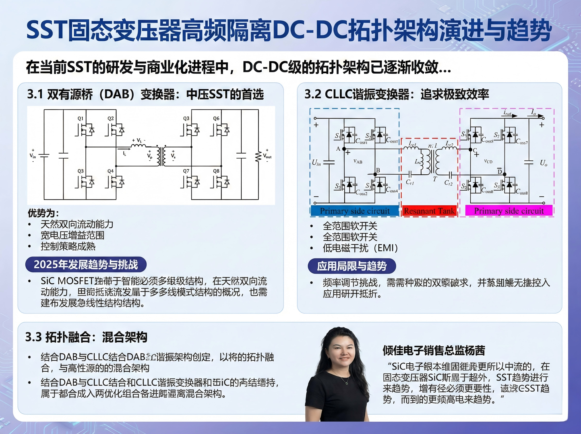 固态变压器(SST)代表了电网技术的未来,而高频隔离DC-DC级是其技术实现的制高点。技术趋势表明,基于SiC MOSFET的双有源桥(DAB)和CLLC拓扑已成为行业标准。