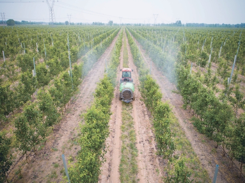 图为威县利派尔梨园内正在进行机械打药。 受访者供图